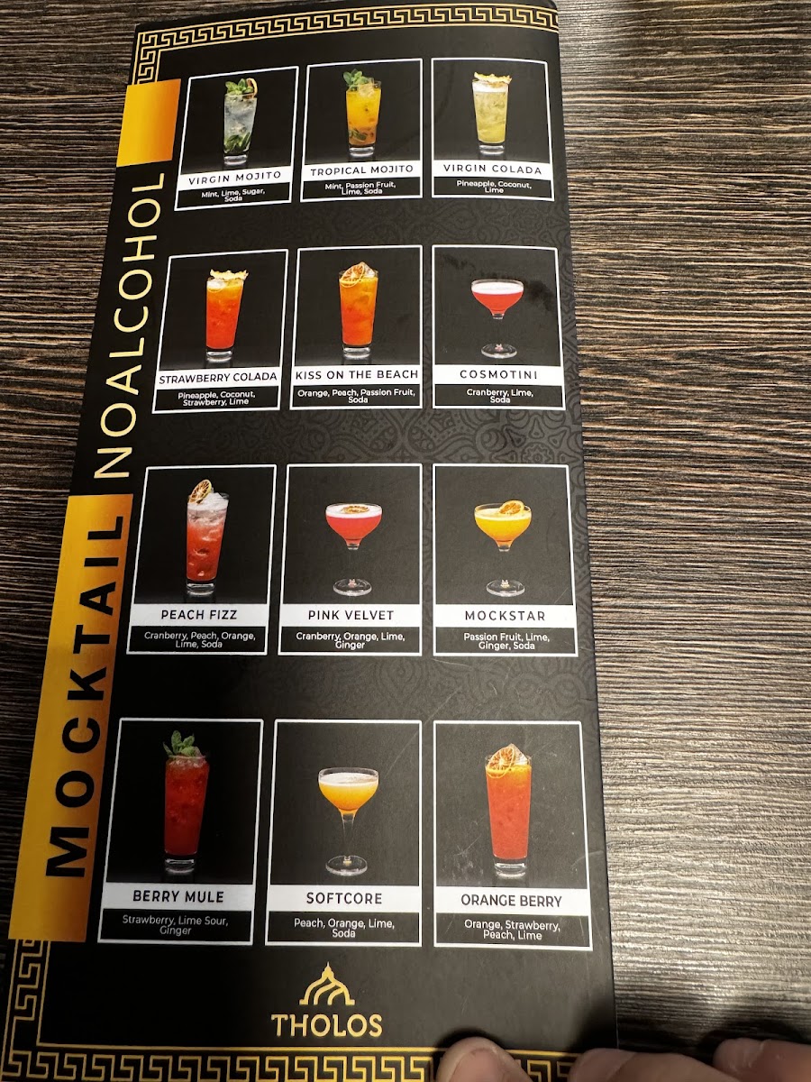 Don't miss the exciting mocktail selection that serves as the perfect refreshment. From the Virgin Mojito to the Kiss on the Beach, these drinks enhance the vibrant dining atmosphere. With a commitment to excellent service and a cozy ambiance, Tholos is an invitation to enjoy the very best of Greek culture and cuisine.